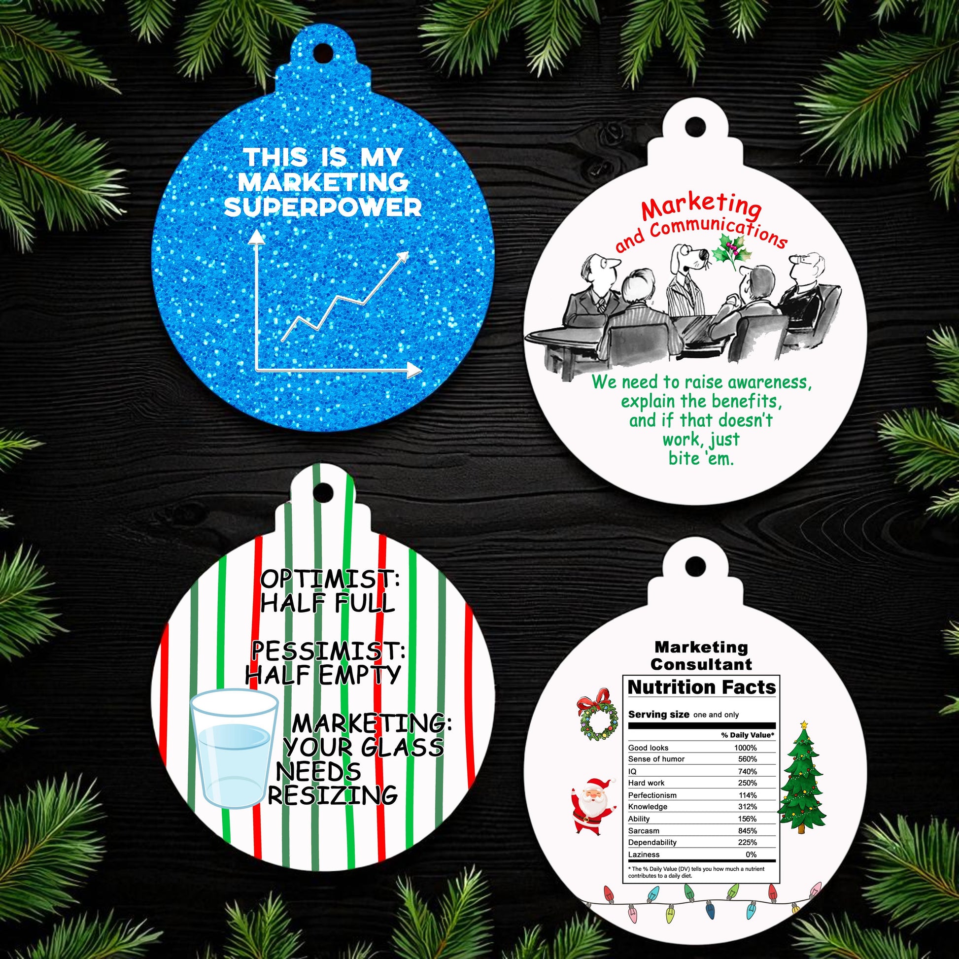 Celebrate the holiday season with a fun twist for your marketing whiz! This 3" ceramic ornament comes ready to hang with a bright red ribbon, making it a playful and festive addition to their Christmas tree. Perfect for showing off their marketing mojo in holiday style!