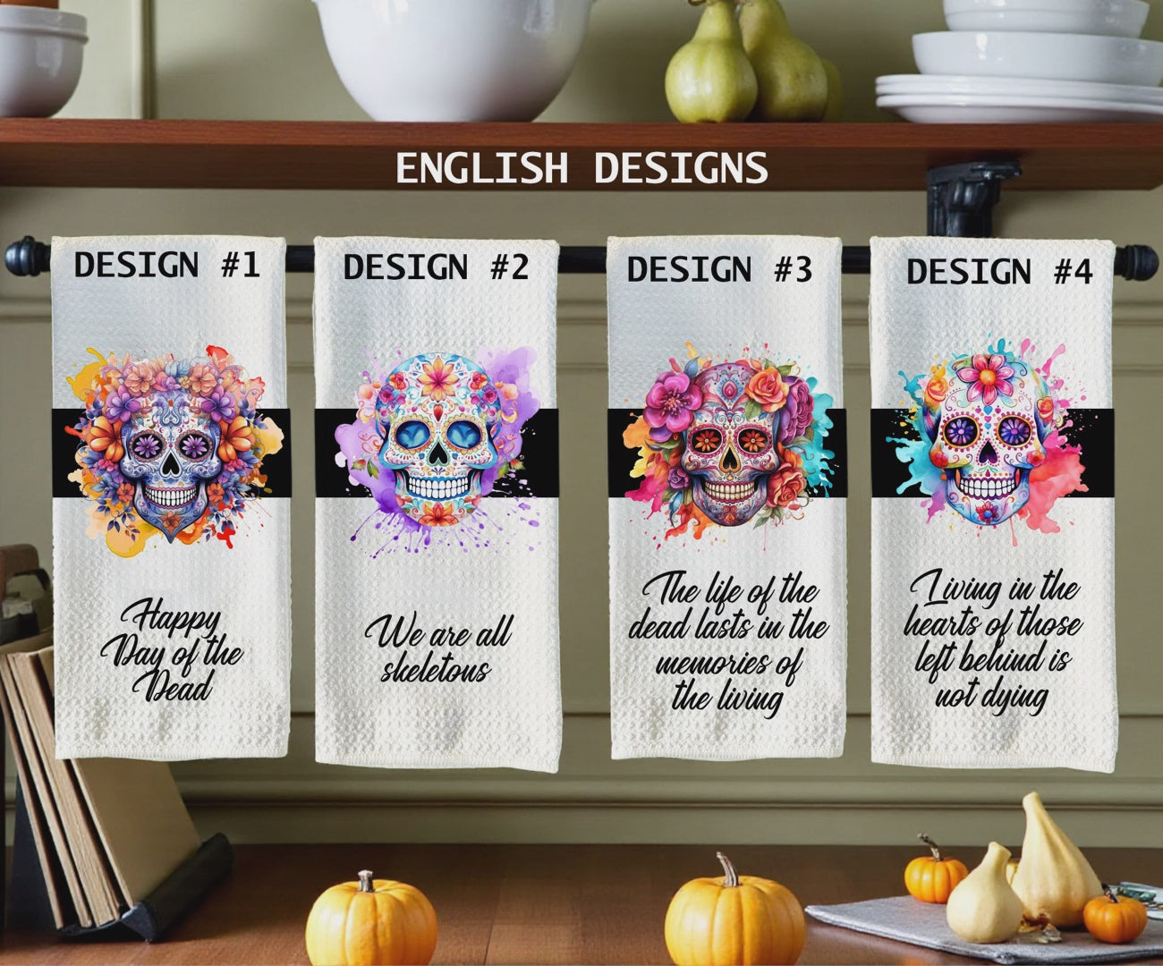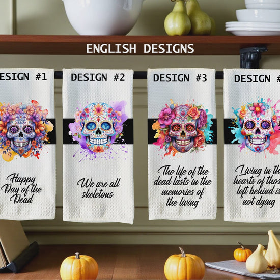 Celebrate the vibrant spirit of Day of the Dead with these beautifully crafted tea towels. Made from pre-washed waffle weave fabric, they offer excellent absorbency and a soft texture that improves with every use. Sized at 16" x 24", these towels are perfect for everyday kitchen tasks or as a festive decorative accent. Available in both English and Spanish, they add a personal touch to your home while honoring tradition and bring both function and cultural charm to your space.