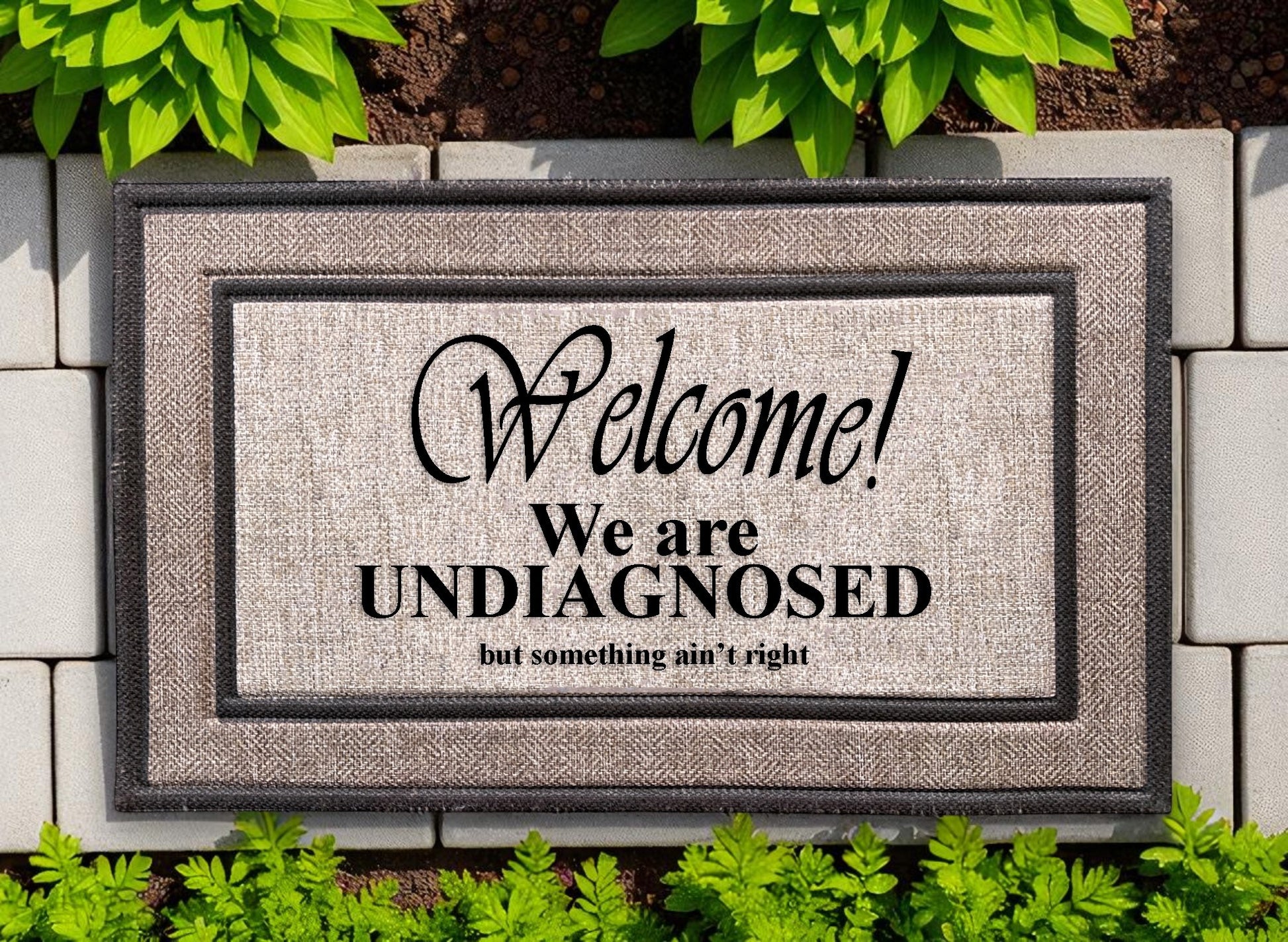 Welcome guests with a dose of humor with our We're Undiagnosed welcome mat! Measuring 18" x 30", this mat is the perfect size for any doorstep. With a quirky "something ain't right" design, it's sure to make your visitors chuckle. Made from a woven polyester surface and a recycled rubber backing, this mat has rubber-textured backing that keeps the mat in place. Durable weather-resistant mat withstands seasonal changes and may be used outside or inside all year long. The polyester woven surface absorbs moisture and scrapes shoes clean. Matt cleans easily by shaking, sweeping or hosing off. Designed for indoor and outdoor use. Perfect for those who don't take themselves too seriously.