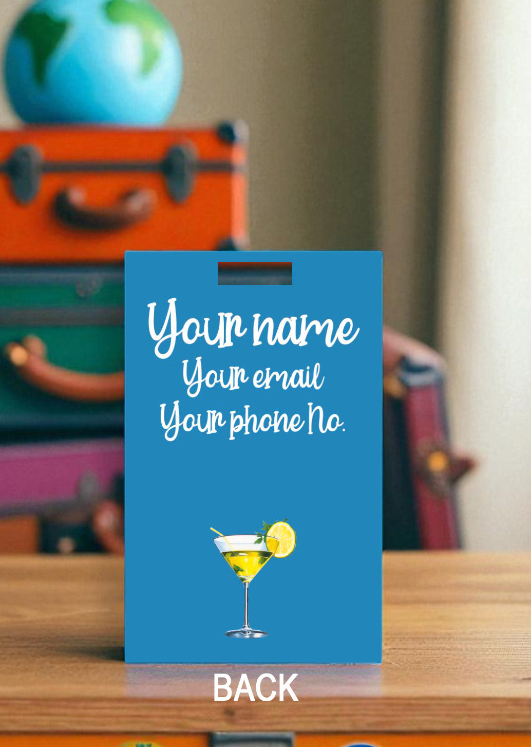 You say layover I say happy hour double-sided luggage tag is personalized on the back with your name, email address, and phone number. Each tag comes with a clear plastic loop strap.